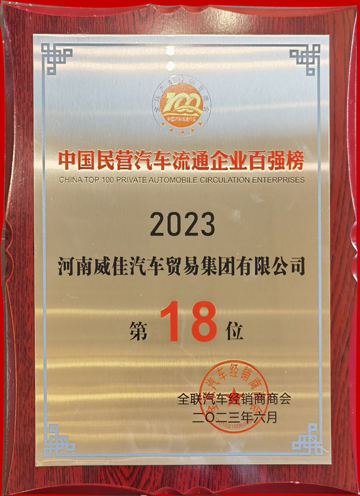 2023年度中国民营汽车流通企业百强榜全国第18位